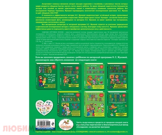 Ассортимент книжных магазинов сегодня насыщен изданиями и пособиями, в рекламных текстах которых щедро раздаются обещания быстро научить читать вашего ребенка. Но одних обещаний недостаточно; большинству авторов этих пособий не хватает практических знаний и элементарного понимания психологии ребенка. Все исследования Надежды Сергеевны Жуковой подтверждены многолетней логопедической практикой. Н.С.Жукова не дает обещаний, она учит. О полезности и эффективности методик Н.С.Жуковой свидетельствует устойчивый интерес, проявляемый к ее методическим пособиям родителями и педагогами. Общий тираж одного только "Букваря" составляет более трех миллионов экземпляров! Дети, занимающиеся по методике Н.С.Жуковой, не имеют проблем при тестировании, предваряющем поступление в школу! Вся методическая литература по авторской программе Н.С.Жуковой строится на сочетании традиционной и оригинальной логопедических методик и объединена в систему.